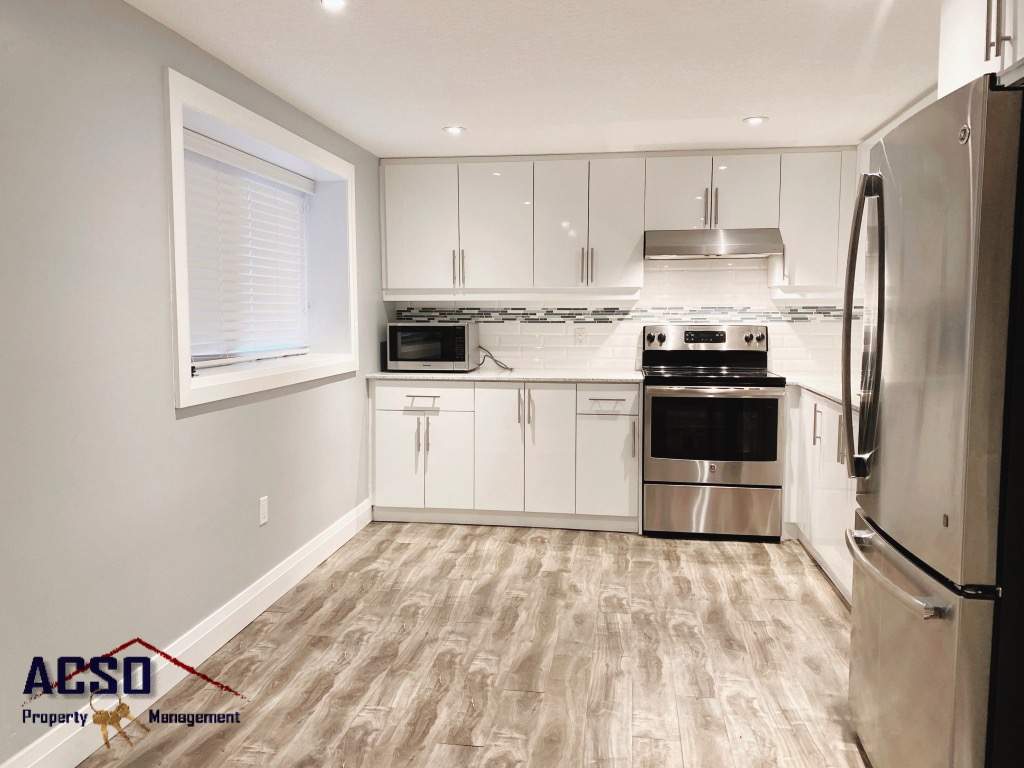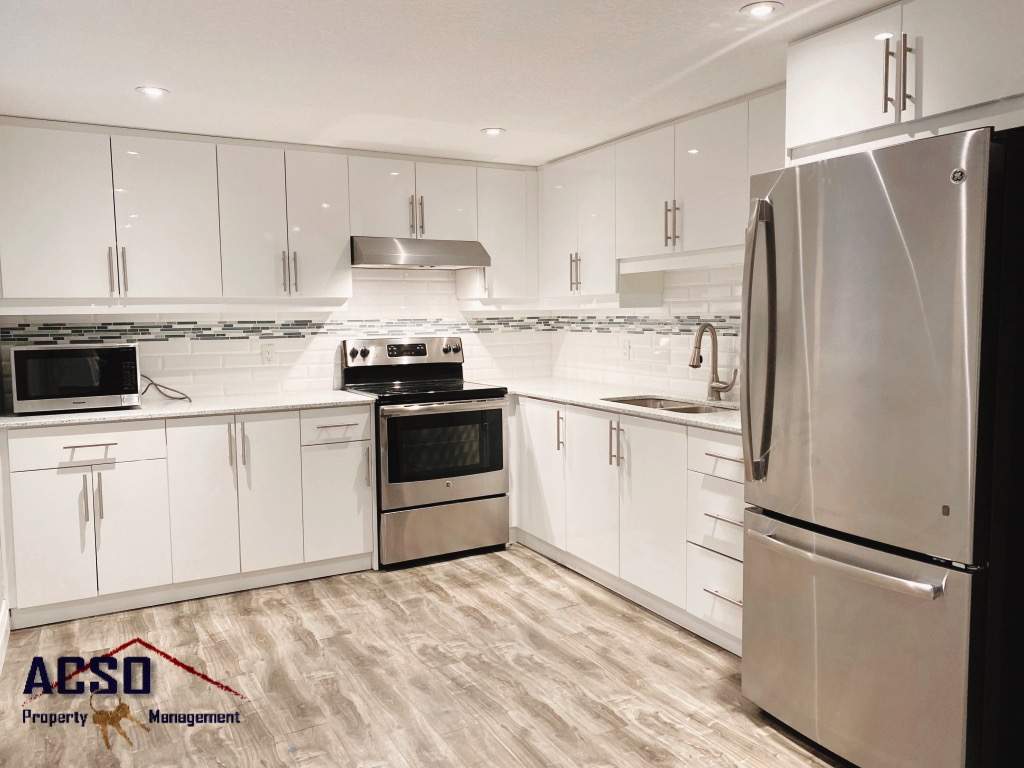 Stunning kitchen: high-gloss cabinets, quartz countertops, subway tile backsplash, stainless steel fridge & stove